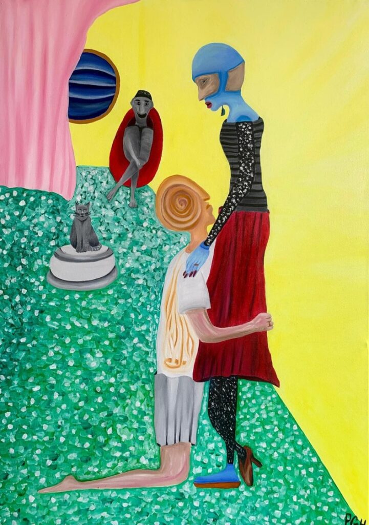 Une palette dense et vibrante ; des figures humaines et animales composent un langage visuel singulier, avec un vocabulaire construit par accumulation et tension. Les œuvres fonctionnent comme des surfaces de projection. Elles n’imposent pas un récit, mais proposent une lecture ouverte et non guidée, activant une résonance intérieure, discrète et durable.